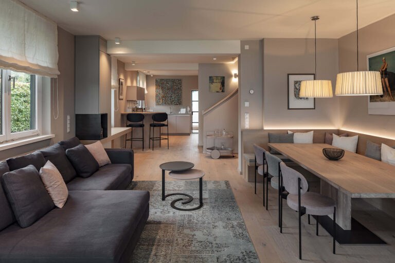 Der Wohnbereich ist ein Ort des Wohlbefindens, an dem Komfort und modernes Design harmonisch zusammenkommen. Eine maßgefertigte Sitznische mit integriertem Arbeitsplatz vereint Ruhe und Produktivität, während die sanften, natürlichen Farben des Interieurs den Räumen eine behagliche Note verleihen.